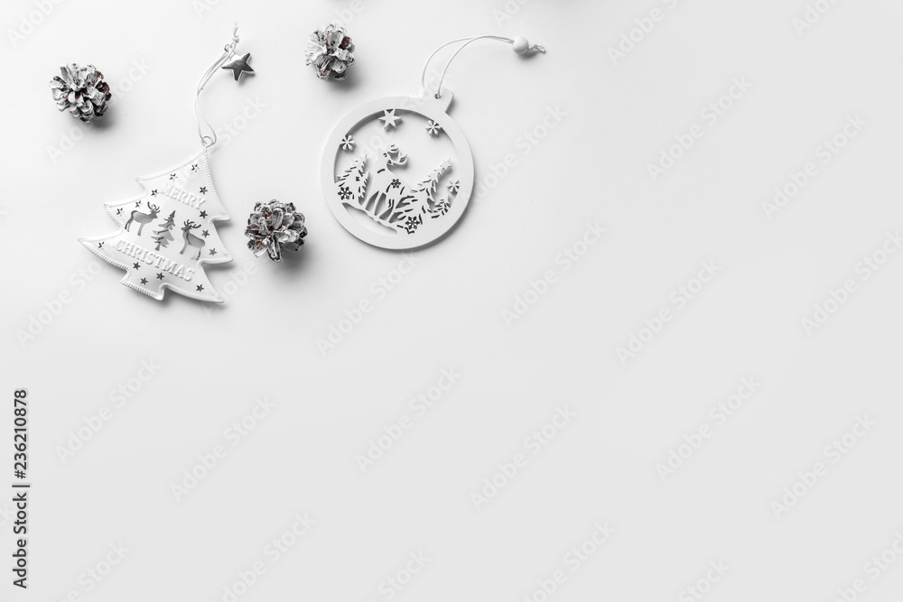 White Christmas decoration on white background with pine cones. Xmas and Happy New Year theme, bokeh, light. Flat lay, top view