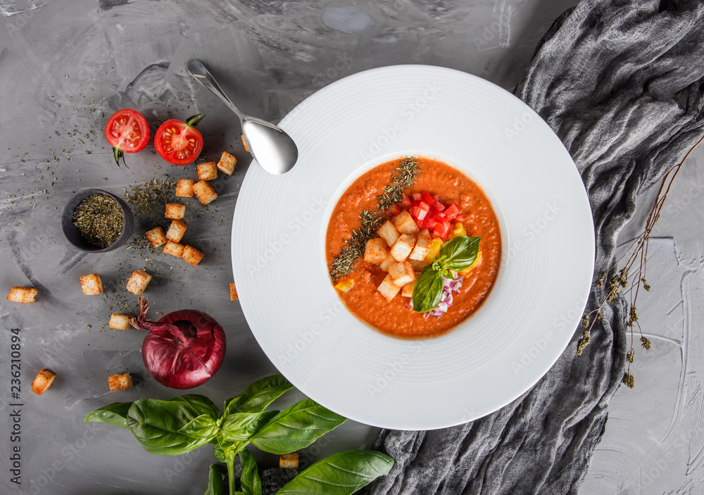 Tomato gazpacho soup with basil, croutons, herbs and vegetables on grey background, Spanish cuisine. Ingredients on table. Top view, flat lay
