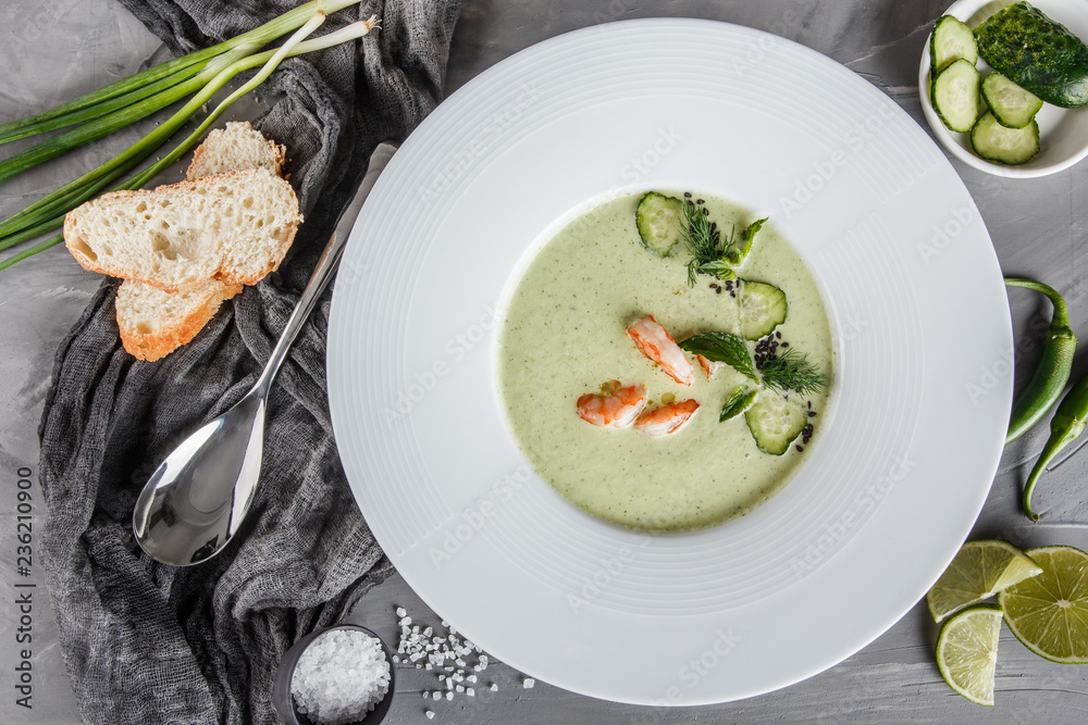 Broccoli green cream soup with shrimp in plate on grey stone background. Clean eating, healthy food concept. Top view, flat lay