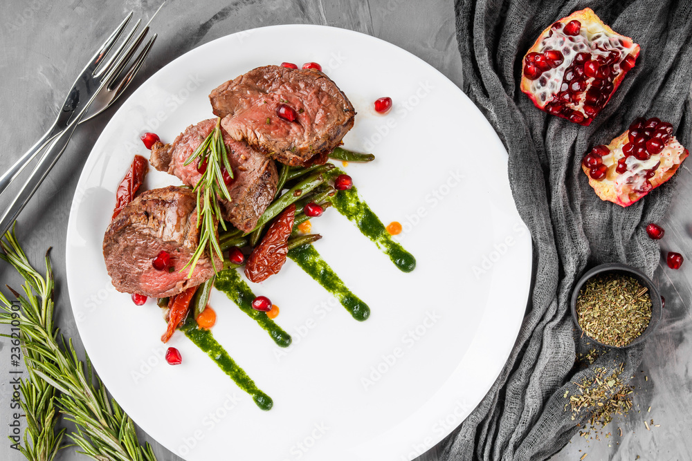 Juicy medium beef fillet steaks mignon with green beans, pomegranate and sauce in plate on grey background. Hot Meat Dishes, top view
