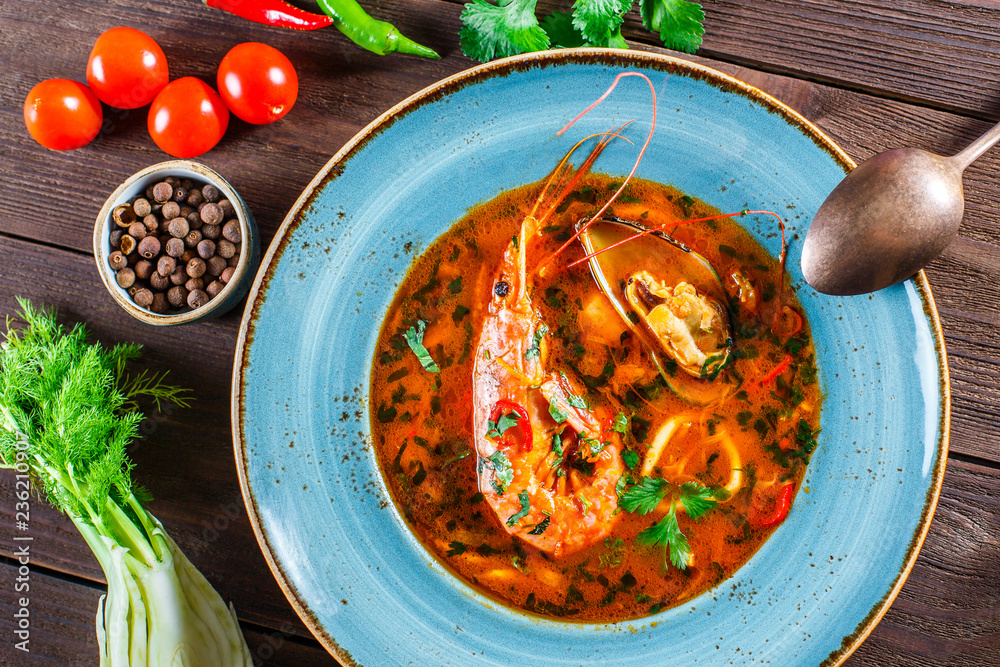 Seafood soup with langoustine, mussels, squid, scallops, fennel, sweet pepper, shrimp on dark wooden background, healthy food. Mediterranean food. Top view