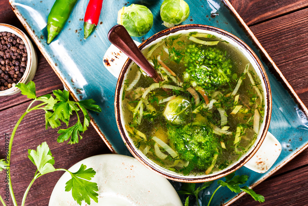 Vegetable soup of broccoli, brussels sprouts and onions on dark wooden background, healthy food. Vegetarian food. Diet food. Top view