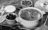 Soup with meat, olives, herbs, lemon, sour cream in bowl, black bread and spices on dark wooden background, homemade food. Traditional Russian soup - solyanka. Top view