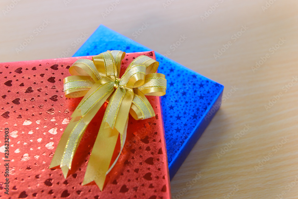 Top view on gift box with bow on wooden background with copy space for Christmas, new year, birthday or Valentine gift. greeting card holidays concept.