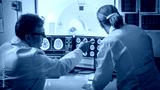 In Control Room Doctor and Radiologist Discuss Diagnosis while Watching Procedure and Monitors Showing Brain Scans Results, In the Background Patient Undergoes MRI or CT Scan Procedure.