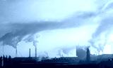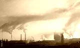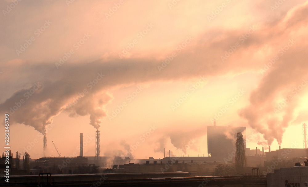 Industrial plant pollutes atmosphere and environment with harmful emissions from chemical processing through factory chimneys against cloudy sky