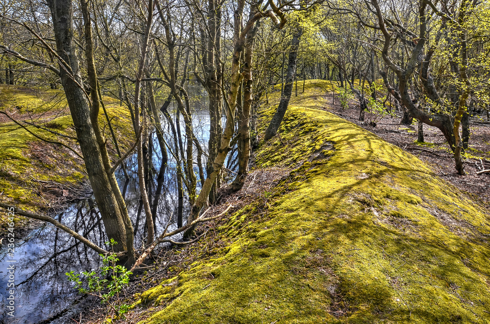 Amrum, Germany, May 2, 2015: Moss-covered dike in the area of the historical Meeram Vogelkoje bird-catching installation