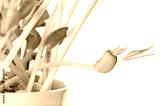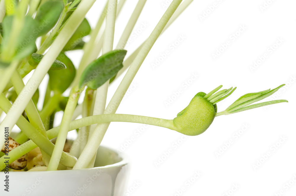 Sweet lupin bean seedlings, closeup. Young plants, sprouted from lupin bean kernels, containing toxic alkaloids. Green sprouts and leafs. Lupinus mutabilis. Front view macro photo on white background.