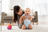 family and motherhood concept - happy smiling young asian mother with little baby at home
