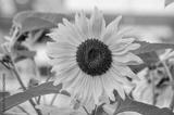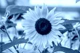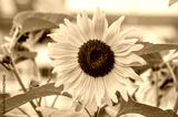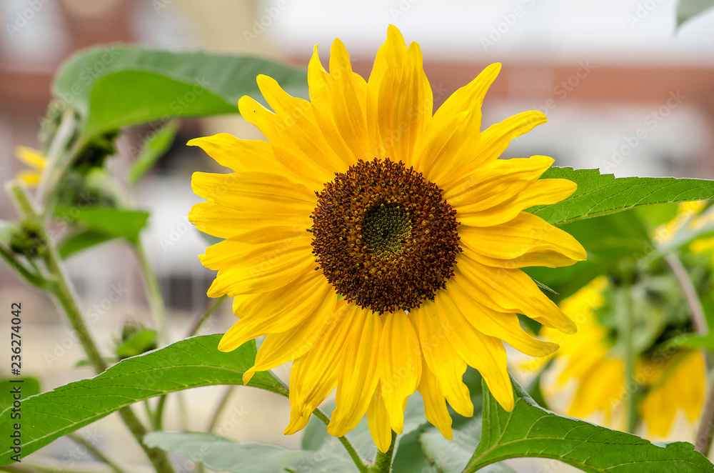 Close-up of a sunflower against a background with a bright white and red bokeh