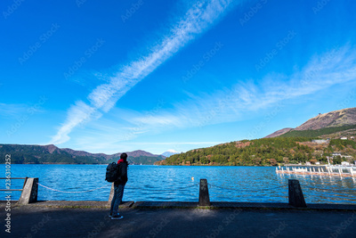 photographer in Mountain Fuji and Lake Ashi with Hakone temple and sightseeing boat in autumn