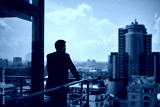 Take a pause. Full length back side portrait of businessman thoughtful standing on office balcony. Copy space on right