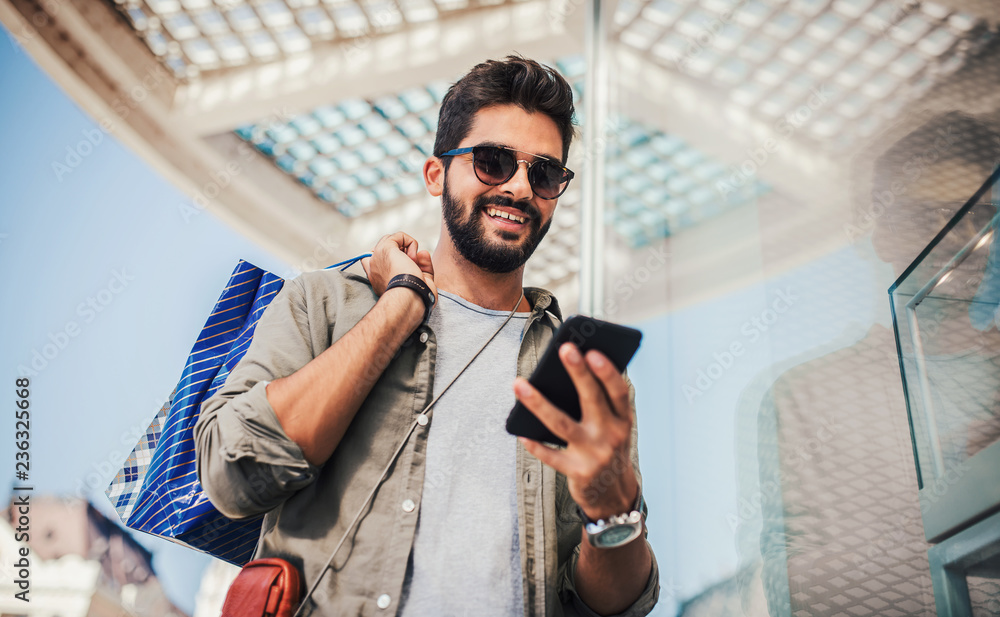 Shopping time. Modern young man with shopping bags making a phone call. Consumerism, shopping, lifestyle concept