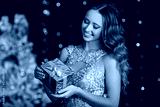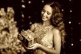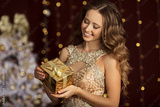 Beautiful happy young girl is wearing fashion golden dress with gift box