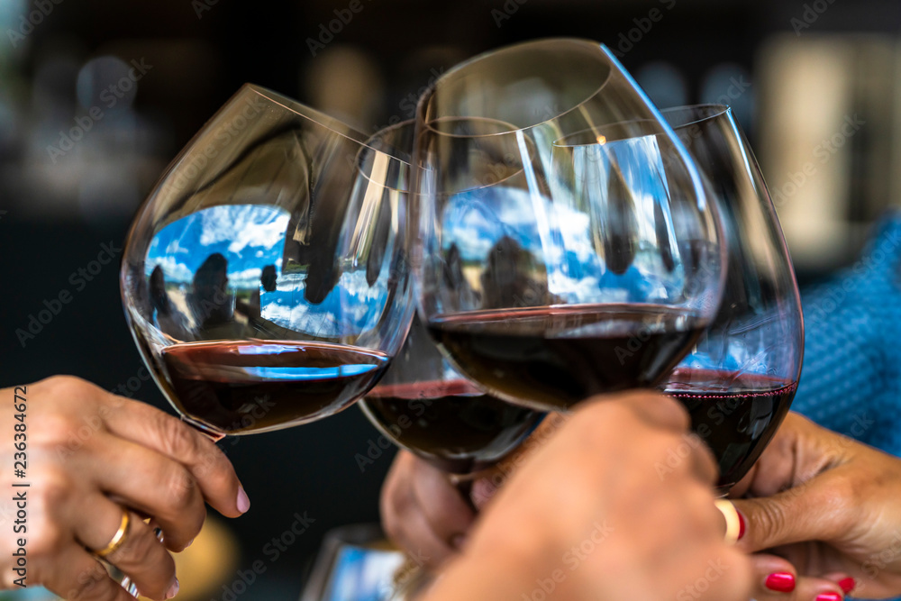 Celebrating Christmas days toasting wine glasses during a celebration day at our vacations during lunch time in a vineyard at Casablanca, Chile