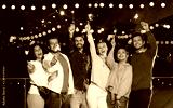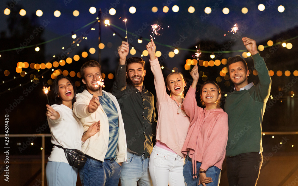 leisure, celebration and people concept - happy friends with sparklers at rooftop party at night with blurred bokeh lights