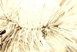 Close-up of snow and frost covered pine cone and pine tree needles, foggy winter day. Weather and changing seasons concept