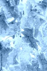 Close-up of yellow tree leaves covered with snow and frost on a cold late autumn day. Weather and changing seasons concept
