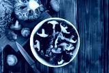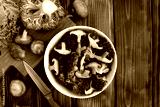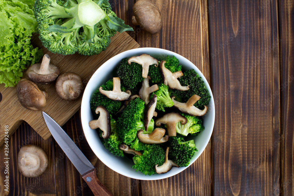 Vegetarian salad with mushrooms shiitake and broccoli in the white bowl on the brown wooden background.Top view.Copy space.Healthy food ingredients.