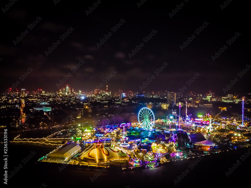 Aerial view of Christmas funfair in Hyde park, London