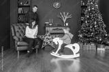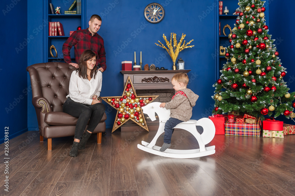 Little girl on a toy horse near a Christmas tree in blue home room.