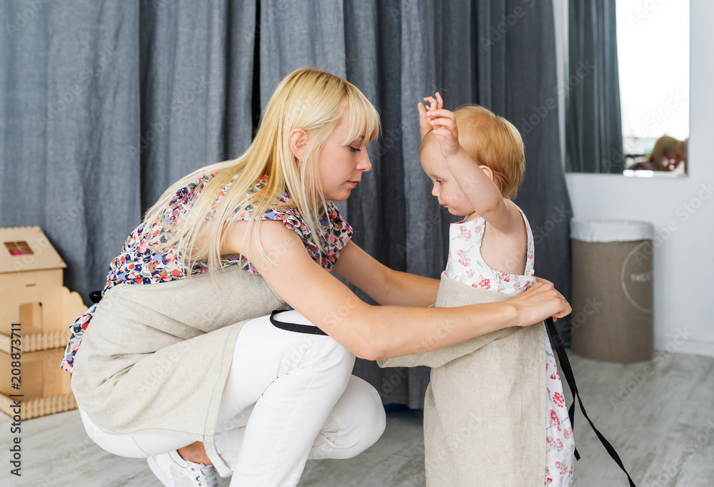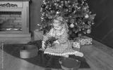 Small girl and dog in present box. Happy little girl with puppy. Winter holiday.