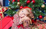Small girl in a beautiful dress embraces a lovely puppy of a dachshund. Closeup portrait