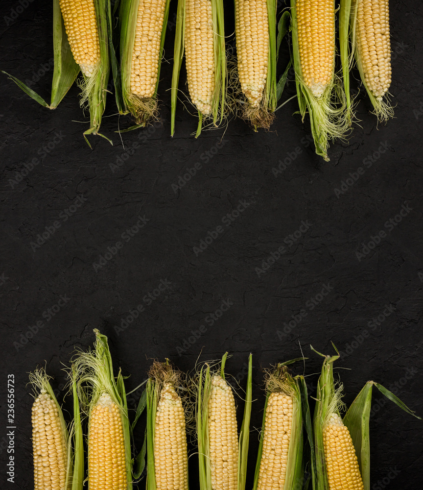Fresh corn on cobs on a dark stone table. Food concept. Copy space top view