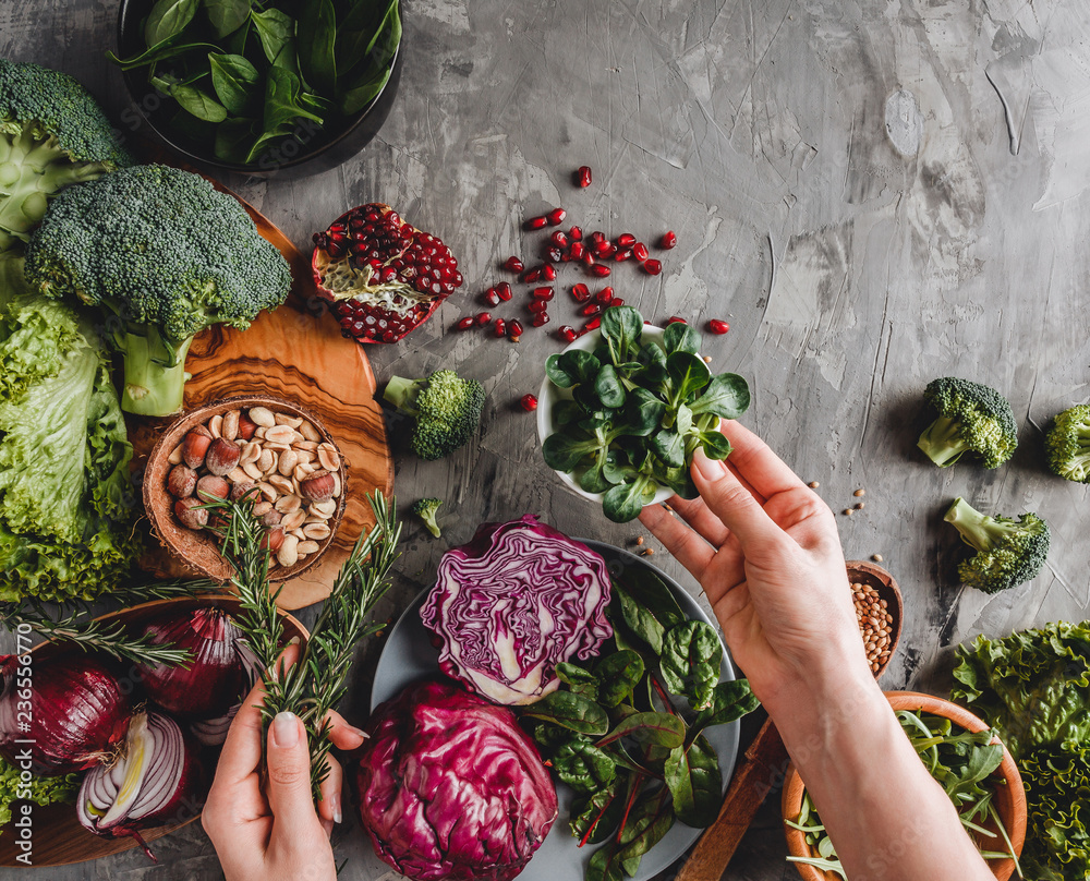 Woman cooking healthy fresh salad with avocado, greens, arugula, spinach in plate over grey background. Healthy vegan food, clean eating, dieting, top view