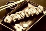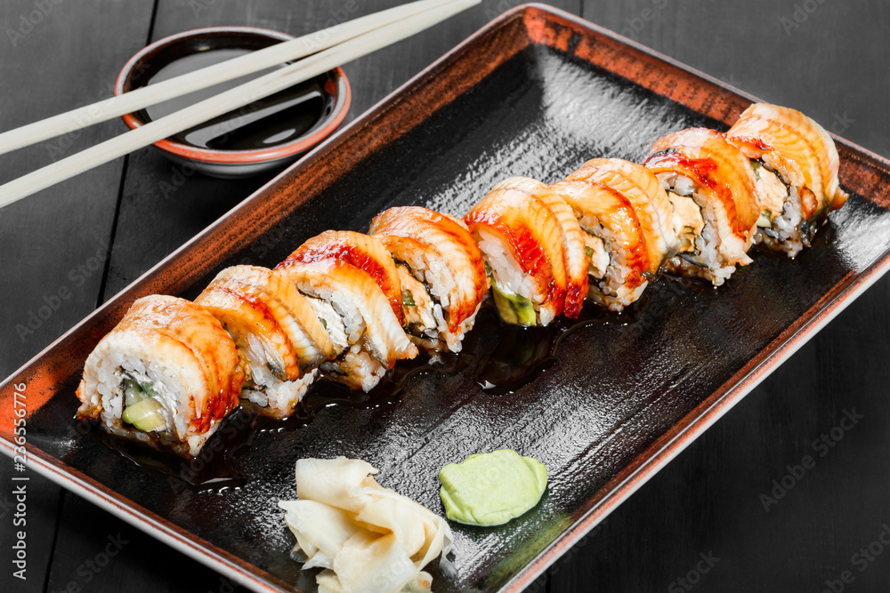 Sushi Roll - Maki Sushi with smoked eel, cucumber, avocado and cream cheese on dark wooden background. Top view. Japanese cuisine