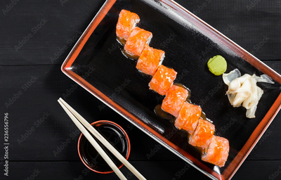 Sushi Roll - Maki Sushi made of salmon, cucumber, avocado and cream cheese on dark wooden background. Top view. Japanese cuisine