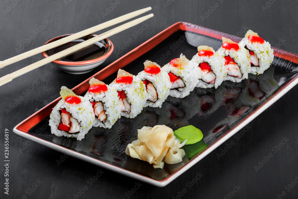 Sushi Roll - Maki Sushi with sea kale, Crab meat, avocado, cream cheese on dark wooden background. Top view. Japanese cuisine