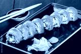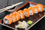 Sushi Roll - Maki Sushi made of salmon, cucumber, avocado and cream cheese on dark wooden background. Top view. Japanese cuisine