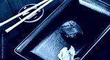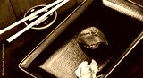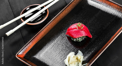 Nigiri with tuna on dark wooden background. Gunkan Sushi set. Japanese cuisine. Top view