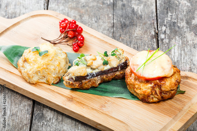 Beef steak and Chicken breast with tomatoes and cheese on cutting board on wooden background. Hot Meat Dishes. Top view