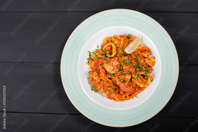 Seafood paella with rice, tomato sauce, langoustine, mussels, squid, shrimp and greens on plate on black wooden background. Mediterranean food. Top view