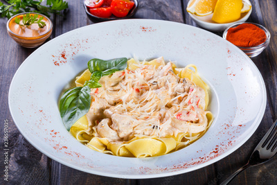 Fettuccine pasta with seafood, squid rings, shrimp, mussels, oysters, tomato, parmesan cheese, basil and cream sauce on plate on dark wooden background, Italian cuisine. Ingredients on table