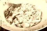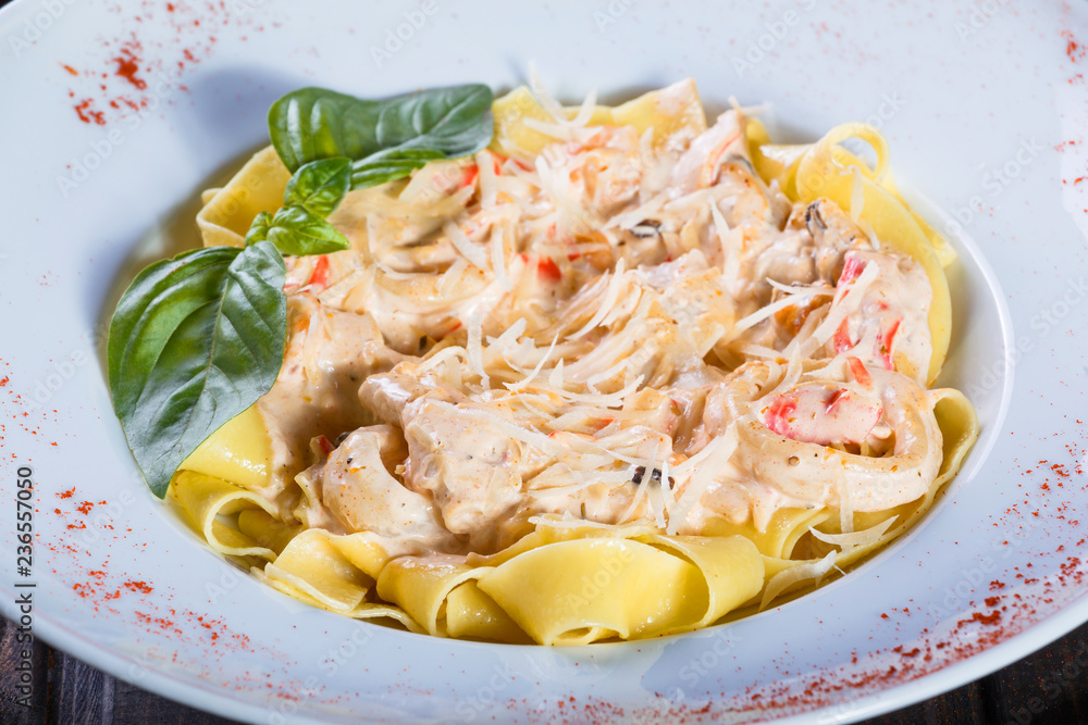 Fettuccine pasta with seafood, squid rings, shrimp, mussels, oysters, tomato, parmesan cheese, basil and cream sauce on plate on dark wooden background, Italian cuisine. Ingredients on table