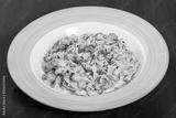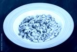 Fettuccine pasta with chicken meat, tomato, mushrooms, cheese sauce and greens on plate on black wooden background. Italian cuisine. Top view