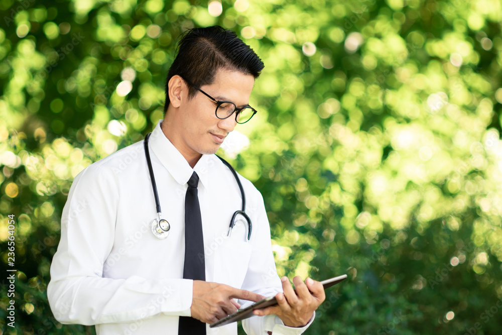 Portrait of asian doctor use tablet with glasses and stethoscope in green nature background.