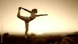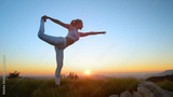 AERIAL: Flexible Caucasian woman holds a scorpion pose in front of the sunset.