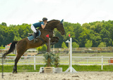Girl jockey riding her brown horse and jumping over the fence on sandy course.