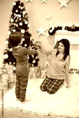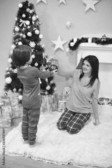 Mom Giving Christmas ornament to a son. Happy family under a Christmas tree