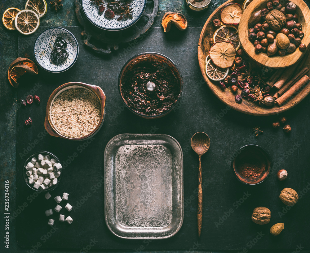 Preparation of homemade vegan chocolate truffle pralines with dried fruits and nuts mix, ingredients on dark background, top view. Healthy sweets. Energy vegan balls with dates, cocoa and almond