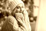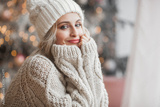 Close up portrait of young beautiful woman on Christmas background. Smiling girl with perfect skin near the Christmas tree.
