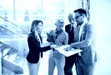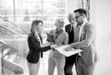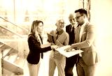 Mature and young businesswoman and a businessman standing in the office analyzing plan