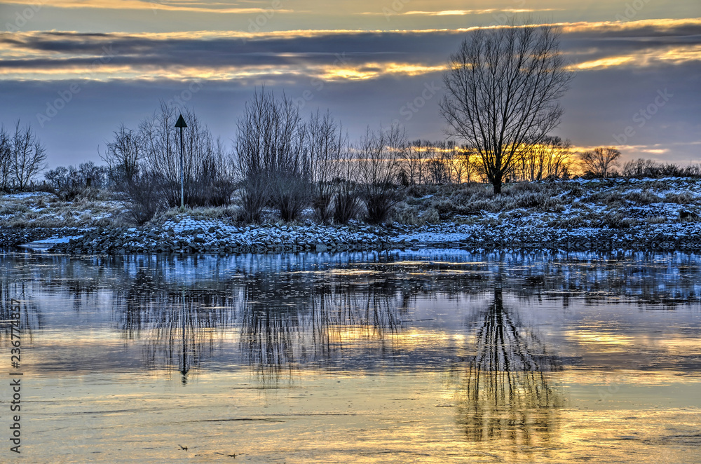 Trees, bushes, a navigation mark, and snow-covered riverbanks reflect in the calm waters of the slow streaming IJssel near Zutphen, The Netherlands during a sunset in winter