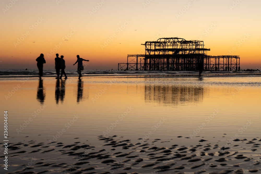 The old remains of Brighton Pier left standing in sea with beautiful waves, seagulls and local people on the beach golden hour in Brighton and Hove's West Pier.