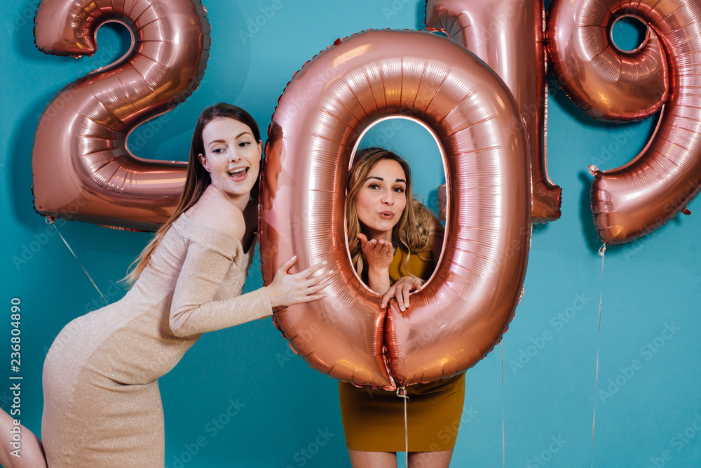 Happy new year and Merry Christmas Beautiful young women with balloons.