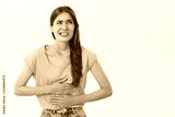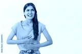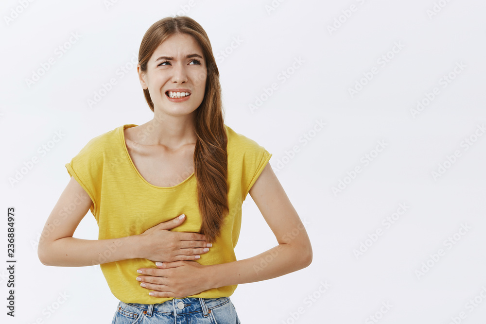 Woman feeling discomfort and sick holding palms on tummy stooping from painful feeling squinting and clenching teeth looking up bothered suffering stomach disorder or periods over white background